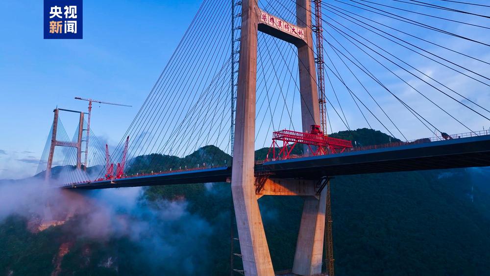 为服务少数民族地区经济发展,大桥增加1.8亿元预算,采用了省道和高速公路同层共建的结构形式,预留了10.25米宽的省道通行功能。因“二合一”的结构设计,主桥纵向边主跨之间和横向桥面之间均为非对称结构,大桥结构重心不居中,仿若在两座山头架起了两个“天秤”,建设难度极高。项目团队迎难而上,用152根斜拉索,270种、819块桥面板,2560个钢结构构件,45.5万个连接构件,在云端之上“拼积木”,建造了这座“颜值”与“技术”并存的大桥。
